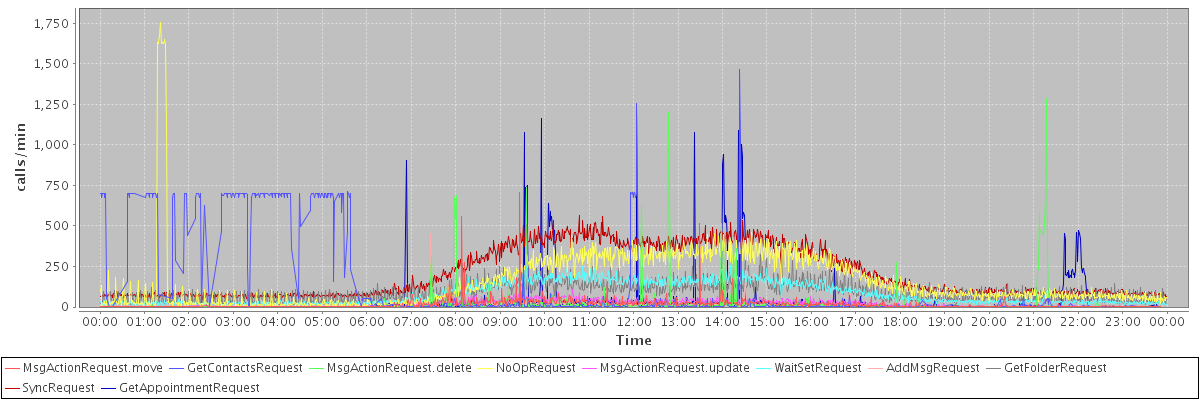 max(MsgActionRequest.move) = 709.00 max(GetContactsRequest) = 1464.00 max(MsgActionRequest.delete) = 1286.00 max(NoOpRequest) = 1757.00 max(MsgActionRequest.update) = 219.00 max(WaitSetRequest) = 258.00 max(AddMsgRequest) = 451.00 max(GetFolderRequest) = 332.00 max(SyncRequest) = 564.00 max(GetAppointmentRequest) = 1240.00