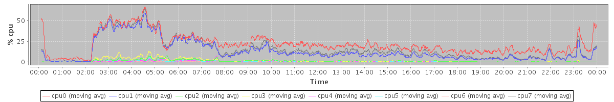 avg(cpu0) = 21.74 avg(cpu1) = 13.36 avg(cpu2) = 1.28 avg(cpu3) = 1.62 avg(cpu4) = 0.77 avg(cpu5) = 0.60 avg(cpu6) = 0.40 avg(cpu7) = 15.33