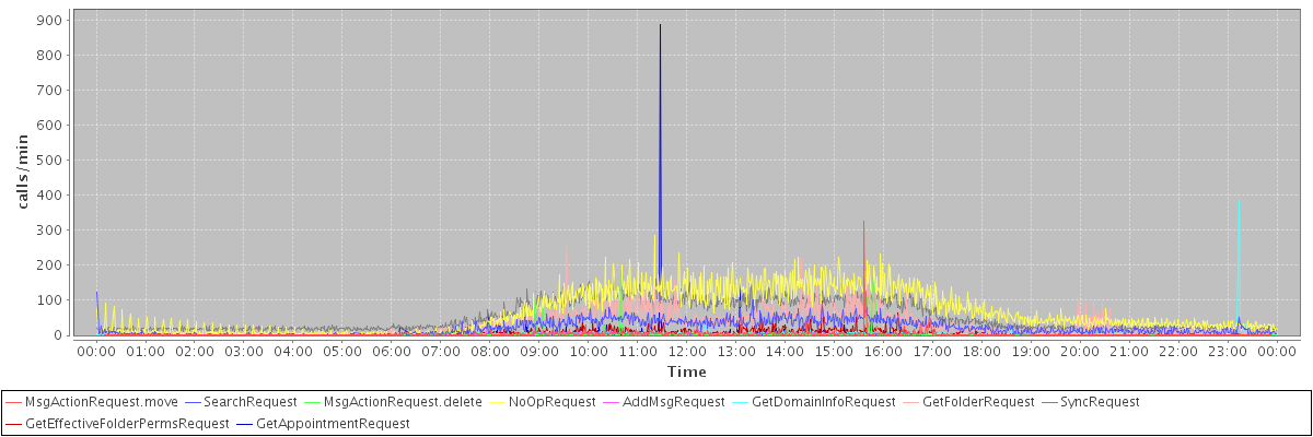 max(MsgActionRequest.move) = 327.00 max(SearchRequest) = 124.00 max(MsgActionRequest.delete) = 186.00 max(NoOpRequest) = 287.00 max(AddMsgRequest) = 126.00 max(GetDomainInfoRequest) = 384.00 max(GetFolderRequest) = 264.00 max(SyncRequest) = 166.00 max(GetEffectiveFolderPermsRequest) = 97.00 max(GetAppointmentRequest) = 889.00