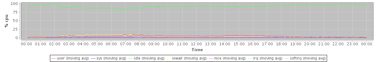 avg(user) = 4.06 avg(sys) = 0.64 avg(idle) = 92.21 avg(iowait) = 2.99 avg(nice) = 0.00 avg(irq) = 0.00 avg(softirq) = 0.10