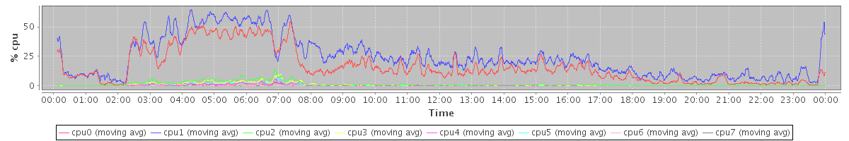 avg(cpu0) = 16.27 avg(cpu1) = 23.77 avg(cpu2) = 1.28 avg(cpu3) = 0.93 avg(cpu4) = 0.43 avg(cpu5) = 0.54 avg(cpu6) = 0.17 avg(cpu7) = 0.18