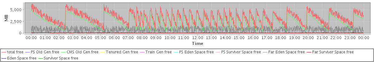 avg(total free) = 3320.54 avg(PS Old Gen free) = 0.00 avg(CMS Old Gen free) = 2486.22 avg(Tenured Gen free) = 0.00 avg(Train Gen free) = 0.00 avg(PS Eden Space free) = 0.00 avg(PS Survivor Space free) = 0.00 avg(Par Eden Space free) = 778.24 avg(Par Survivor Space free) = 56.08 avg(Eden Space free) = 0.00 avg(Survivor Space free) = 0.00