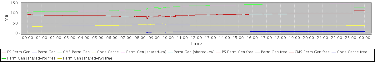avg(PS Perm Gen) = 0.00 avg(Perm Gen) = 0.00 avg(CMS Perm Gen) = 128.52 avg(Code Cache) = 38.46 avg(Perm Gen [shared-ro]) = 0.00 avg(Perm Gen [shared-rw]) = 0.00 avg(PS Perm Gen free) = 0.00 avg(Perm Gen free) = 0.00 avg(CMS Perm Gen free) = 90.49 avg(Code Cache free) = 4.75 avg(Perm Gen [shared-ro] free) = 0.00 avg(Perm Gen [shared-rw] free) = 0.00