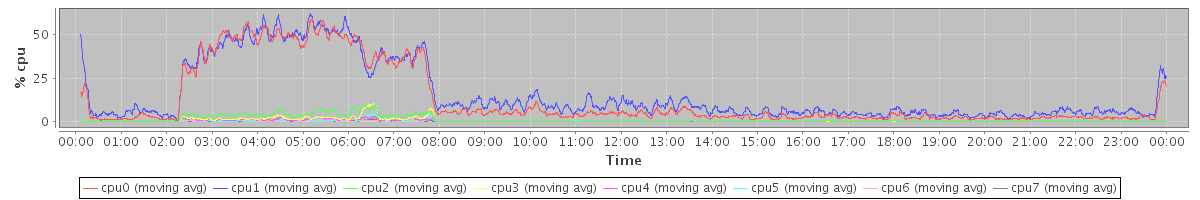 avg(cpu0) = 9.34 avg(cpu1) = 8.88 avg(cpu2) = 2.79 avg(cpu3) = 2.19 avg(cpu4) = 1.65 avg(cpu5) = 1.31 avg(cpu6) = 1.11 avg(cpu7) = 0.87