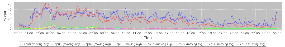 avg(cpu0) = 17.23 avg(cpu1) = 22.28 avg(cpu2) = 1.33 avg(cpu3) = 0.77 avg(cpu4) = 0.44 avg(cpu5) = 0.37 avg(cpu6) = 0.16 avg(cpu7) = 0.16