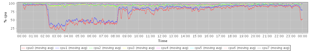 avg(cpu0) = 15.94 avg(cpu1) = 11.56 avg(cpu2) = 0.52 avg(cpu3) = 0.70 avg(cpu4) = 0.21 avg(cpu5) = 0.18 avg(cpu6) = 0.20 avg(cpu7) = 0.05