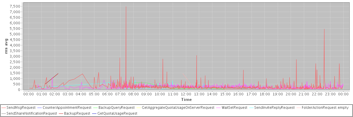 avg(SendMsgRequest) = 265.87 avg(CounterAppointmentRequest) = 211.00 avg(BackupQueryRequest) = 308.40 avg(GetAggregateQuotaUsageOnServerRequest) = 965.00 avg(WaitSetRequest) = 196.22 avg(SendInviteReplyRequest) = 212.20 avg(FolderActionRequest.empty) = 383.78 avg(SendShareNotificationRequest) = 211.25 avg(BackupRequest) = 977.00 avg(GetQuotaUsageRequest) = 1028.00
