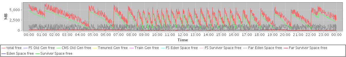 avg(total free) = 3540.28 avg(PS Old Gen free) = 0.00 avg(CMS Old Gen free) = 2628.66 avg(Tenured Gen free) = 0.00 avg(Train Gen free) = 0.00 avg(PS Eden Space free) = 0.00 avg(PS Survivor Space free) = 0.00 avg(Par Eden Space free) = 795.40 avg(Par Survivor Space free) = 116.22 avg(Eden Space free) = 0.00 avg(Survivor Space free) = 0.00