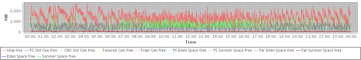 avg(total free) = 1425.73 avg(PS Old Gen free) = 0.00 avg(CMS Old Gen free) = 902.21 avg(Tenured Gen free) = 0.00 avg(Train Gen free) = 0.00 avg(PS Eden Space free) = 0.00 avg(PS Survivor Space free) = 0.00 avg(Par Eden Space free) = 484.61 avg(Par Survivor Space free) = 38.91 avg(Eden Space free) = 0.00 avg(Survivor Space free) = 0.00