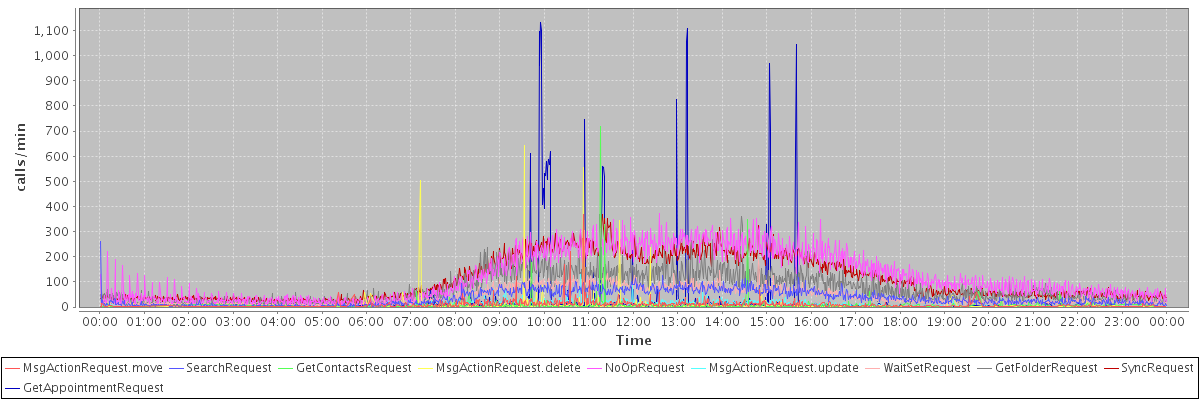 max(MsgActionRequest.move) = 370.00 max(SearchRequest) = 261.00 max(GetContactsRequest) = 718.00 max(MsgActionRequest.delete) = 644.00 max(NoOpRequest) = 371.00 max(MsgActionRequest.update) = 128.00 max(WaitSetRequest) = 189.00 max(GetFolderRequest) = 368.00 max(SyncRequest) = 368.00 max(GetAppointmentRequest) = 1133.00