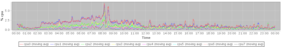 avg(cpu0) = 1.46 avg(cpu1) = 1.41 avg(cpu2) = 0.78 avg(cpu3) = 0.71 avg(cpu4) = 0.50 avg(cpu5) = 0.47 avg(cpu6) = 0.51 avg(cpu7) = 0.27
