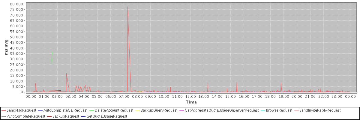 avg(SendMsgRequest) = 569.37 avg(AutoCompleteGalRequest) = 147.83 avg(DeleteAccountRequest) = 30926.50 avg(BackupQueryRequest) = 208.00 avg(GetAggregateQuotaUsageOnServerRequest) = 1155.00 avg(BrowseRequest) = 181.33 avg(SendInviteReplyRequest) = 209.00 avg(AutoCompleteRequest) = 163.06 avg(BackupRequest) = 1273.50 avg(GetQuotaUsageRequest) = 1345.00