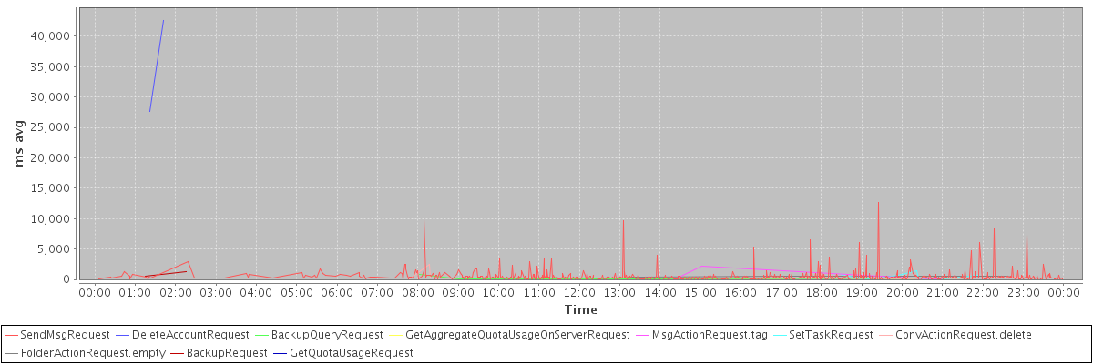 avg(SendMsgRequest) = 501.54 avg(DeleteAccountRequest) = 35115.50 avg(BackupQueryRequest) = 264.00 avg(GetAggregateQuotaUsageOnServerRequest) = 1301.00 avg(MsgActionRequest.tag) = 278.62 avg(SetTaskRequest) = 308.41 avg(ConvActionRequest.delete) = 284.38 avg(FolderActionRequest.empty) = 427.00 avg(BackupRequest) = 854.50 avg(GetQuotaUsageRequest) = 1557.00