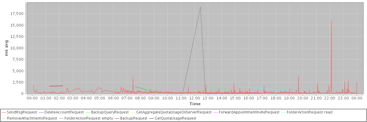 avg(SendMsgRequest) = 286.87 avg(DeleteAccountRequest) = 10198.00 avg(BackupQueryRequest) = 579.20 avg(GetAggregateQuotaUsageOnServerRequest) = 1016.00 avg(ForwardAppointmentInviteRequest) = 292.00 avg(FolderActionRequest.read) = 745.00 avg(RemoveAttachmentsRequest) = 1382.50 avg(FolderActionRequest.empty) = 3509.50 avg(BackupRequest) = 1655.00 avg(GetQuotaUsageRequest) = 1135.00