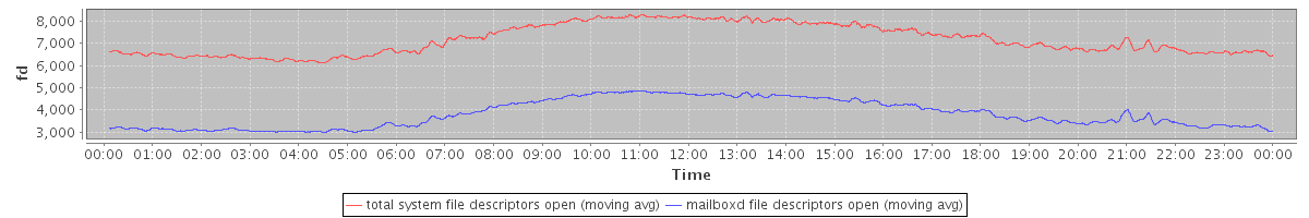 avg(total system file descriptors open) = 7164.83 avg(mailboxd file descriptors open) = 3822.89