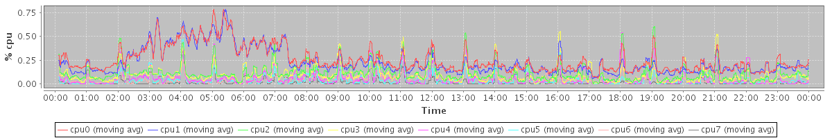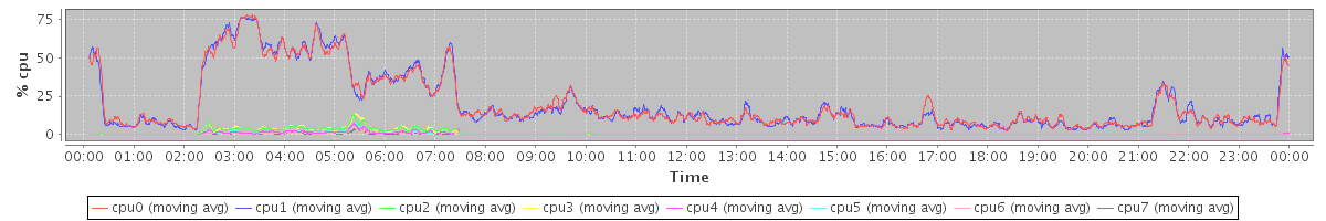 avg(cpu0) = 1.31 avg(cpu1) = 1.22 avg(cpu2) = 0.74 avg(cpu3) = 0.68 avg(cpu4) = 0.45 avg(cpu5) = 0.40 avg(cpu6) = 0.38 avg(cpu7) = 0.21