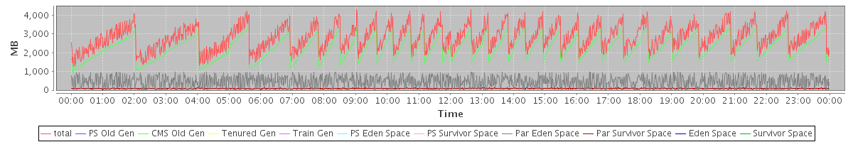 avg(total) = 2837.99 avg(PS Old Gen) = 0.00 avg(CMS Old Gen) = 2279.69 avg(Tenured Gen) = 0.00 avg(Train Gen) = 0.00 avg(PS Eden Space) = 0.00 avg(PS Survivor Space) = 0.00 avg(Par Eden Space) = 469.71 avg(Par Survivor Space) = 88.59 avg(Eden Space) = 0.00 avg(Survivor Space) = 0.00