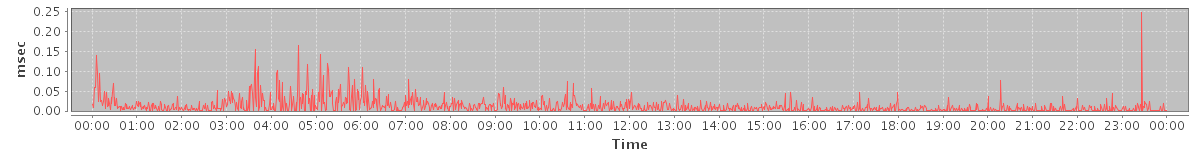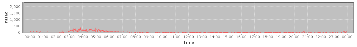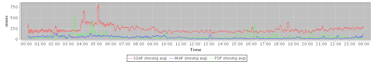 avg(ModifyAppointmentRequest) = 250.58 avg(SendMsgRequest) = 331.60 avg(BackupQueryRequest) = 256.00 avg(GetAggregateQuotaUsageOnServerRequest) = 1324.00 avg(ModifyFilterRulesRequest) = 4692.00 avg(SendInviteReplyRequest) = 337.44 avg(ContactActionRequest.delete) = 365.00 avg(SyncGalAccountRequest) = 64039.58 avg(BackupRequest) = 2346.50 avg(GetQuotaUsageRequest) = 1362.00
