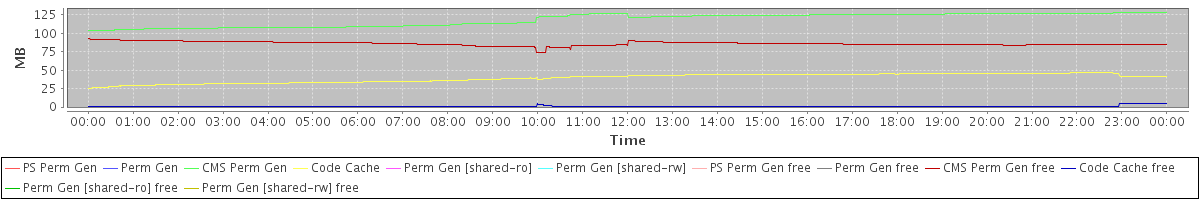 avg(PS Perm Gen) = 0.00 avg(Perm Gen) = 0.00 avg(CMS Perm Gen) = 118.58 avg(Code Cache) = 39.38 avg(Perm Gen [shared-ro]) = 0.00 avg(Perm Gen [shared-rw]) = 0.00 avg(PS Perm Gen free) = 0.00 avg(Perm Gen free) = 0.00 avg(CMS Perm Gen free) = 86.00 avg(Code Cache free) = 0.65 avg(Perm Gen [shared-ro] free) = 0.00 avg(Perm Gen [shared-rw] free) = 0.00