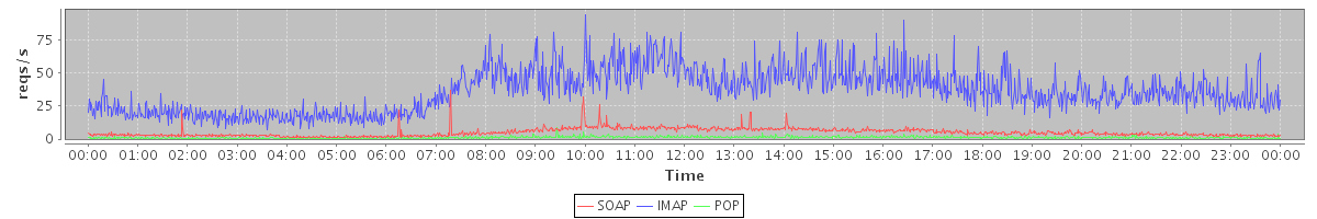 Host zm04.stanford.edu: Mailboxd: Request Rate by Client Protocol