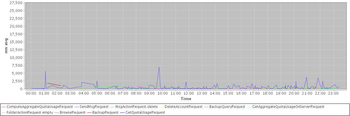 avg(ComputeAggregateQuotaUsageRequest) = 2301.00 avg(SendMsgRequest) = 479.42 avg(MsgActionRequest.delete) = 225.32 avg(DeleteAccountRequest) = 26292.00 avg(BackupQueryRequest) = 306.40 avg(GetAggregateQuotaUsageOnServerRequest) = 1071.00 avg(FolderActionRequest.empty) = 222.50 avg(BrowseRequest) = 266.00 avg(BackupRequest) = 1455.00 avg(GetQuotaUsageRequest) = 2297.00