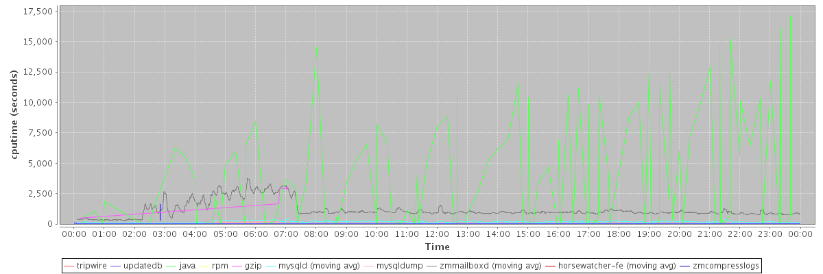 avg(tripwire) = 2256.00 avg(updatedb) = 30.35 avg(java) = 2277.00 avg(rpm) = 15.67 avg(gzip) = 2822.20 avg(mysqld) = 177.06 avg(mysqldump) = 170.84 avg(zmmailboxd) = 1158.47 avg(horsewatcher-fe) = 15.62 avg(zmcompresslogs) = 1014.00