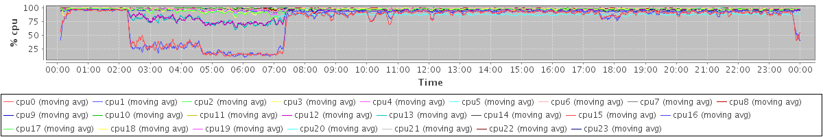 avg(cpu0) = 14.70 avg(cpu1) = 14.66 avg(cpu2) = 0.65 avg(cpu3) = 0.65 avg(cpu4) = 0.33 avg(cpu5) = 0.32 avg(cpu6) = 0.12 avg(cpu7) = 0.11 avg(cpu8) = 0.13 avg(cpu9) = 0.11 avg(cpu10) = 0.04 avg(cpu11) = 0.07 avg(cpu12) = 3.76 avg(cpu13) = 3.96 avg(cpu14) = 0.10 avg(cpu15) = 0.07 avg(cpu16) = 0.07 avg(cpu17) = 0.09 avg(cpu18) = 0.02 avg(cpu19) = 0.04 avg(cpu20) = 0.04 avg(cpu21) = 0.01 avg(cpu22) = 0.01 avg(cpu23) = 0.01