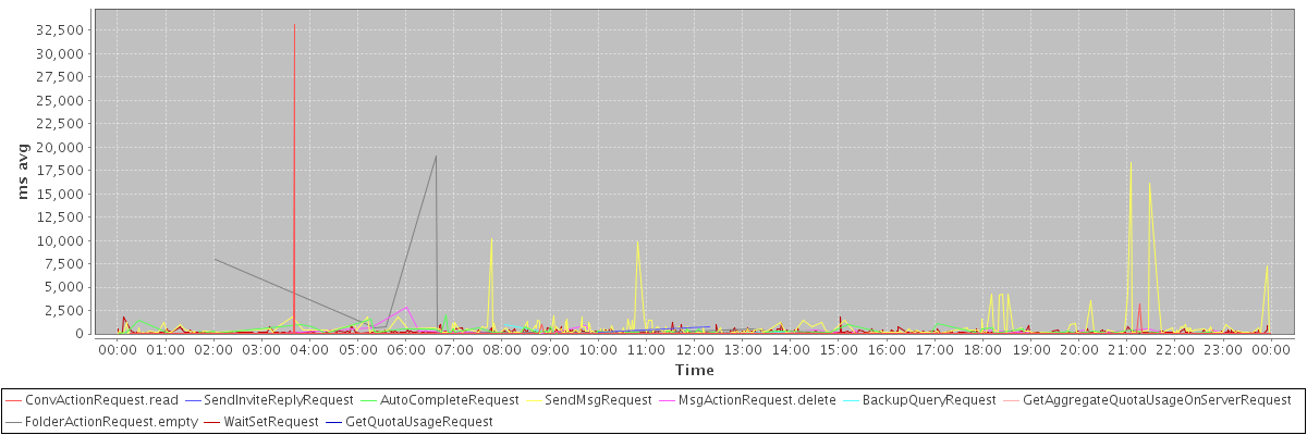 avg(ConvActionRequest.read) = 126.62 avg(SendInviteReplyRequest) = 440.00 avg(AutoCompleteRequest) = 177.20 avg(SendMsgRequest) = 622.56 avg(MsgActionRequest.delete) = 124.38 avg(BackupQueryRequest) = 271.20 avg(GetAggregateQuotaUsageOnServerRequest) = 1071.00 avg(FolderActionRequest.empty) = 3307.22 avg(WaitSetRequest) = 99.52 avg(GetQuotaUsageRequest) = 1232.00