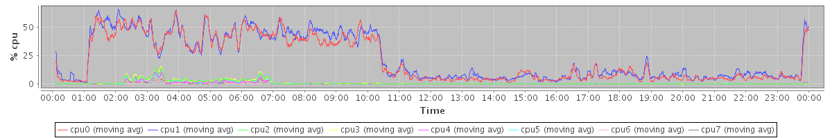 avg(cpu0) = 20.76 avg(cpu1) = 22.57 avg(cpu2) = 0.97 avg(cpu3) = 1.04 avg(cpu4) = 0.54 avg(cpu5) = 0.55 avg(cpu6) = 0.28 avg(cpu7) = 0.25