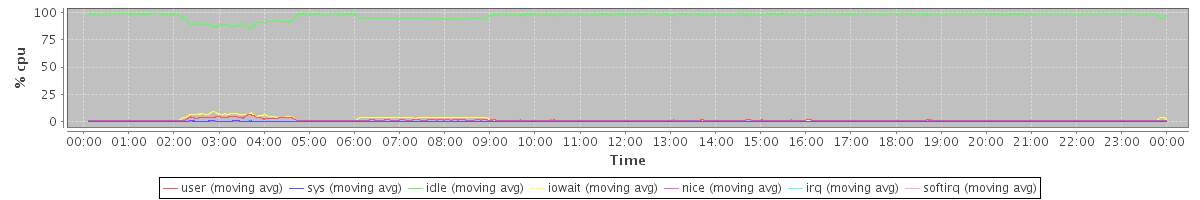 avg(user) = 1.37 avg(sys) = 0.22 avg(idle) = 97.10 avg(iowait) = 1.29 avg(nice) = 0.00 avg(irq) = 0.00 avg(softirq) = 0.00