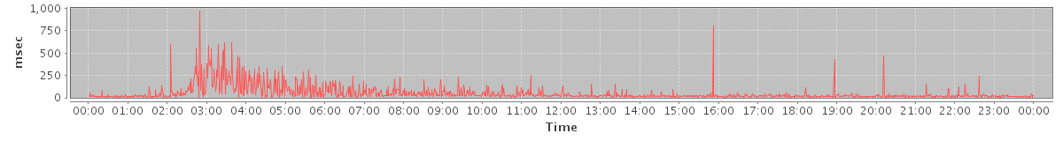 avg(SendMsgRequest) = 584.79 avg(DeleteAccountRequest) = 2282.00 avg(BackupQueryRequest) = 242.20 avg(CreateMountpointRequest) = 190.00 avg(GetAggregateQuotaUsageOnServerRequest) = 950.00 avg(GetFreeBusyRequest) = 271.57 avg(BrowseRequest) = 354.00 avg(FolderActionRequest.empty) = 537.50 avg(BackupRequest) = 1118.00 avg(GetQuotaUsageRequest) = 1117.00