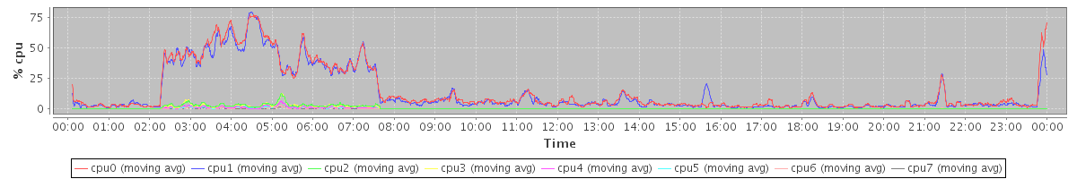 avg(cpu0) = 7.92 avg(cpu1) = 7.14 avg(cpu2) = 1.58 avg(cpu3) = 1.32 avg(cpu4) = 0.88 avg(cpu5) = 0.70 avg(cpu6) = 4.79 avg(cpu7) = 0.43