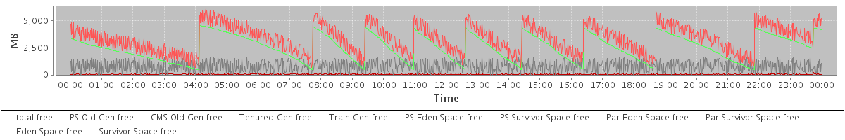 avg(total free) = 3367.12 avg(PS Old Gen free) = 0.00 avg(CMS Old Gen free) = 2516.39 avg(Tenured Gen free) = 0.00 avg(Train Gen free) = 0.00 avg(PS Eden Space free) = 0.00 avg(PS Survivor Space free) = 0.00 avg(Par Eden Space free) = 799.50 avg(Par Survivor Space free) = 51.23 avg(Eden Space free) = 0.00 avg(Survivor Space free) = 0.00