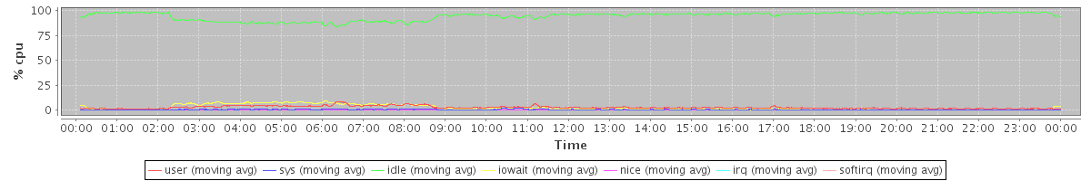 avg(user) = 2.64 avg(sys) = 0.44 avg(idle) = 94.50 avg(iowait) = 2.37 avg(nice) = 0.00 avg(irq) = 0.00 avg(softirq) = 0.04