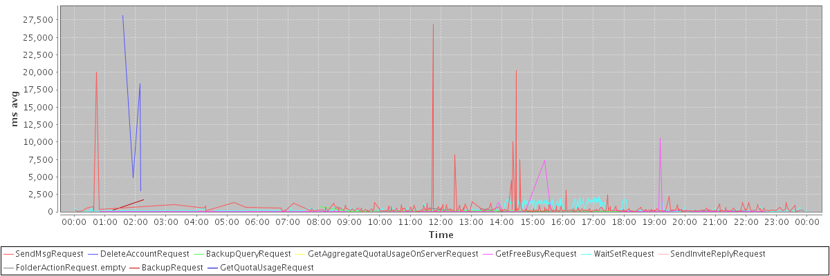 avg(SendMsgRequest) = 569.95 avg(DeleteAccountRequest) = 13590.50 avg(BackupQueryRequest) = 217.00 avg(GetAggregateQuotaUsageOnServerRequest) = 1069.00 avg(GetFreeBusyRequest) = 258.70 avg(WaitSetRequest) = 214.47 avg(SendInviteReplyRequest) = 229.00 avg(FolderActionRequest.empty) = 234.57 avg(BackupRequest) = 1004.50 avg(GetQuotaUsageRequest) = 1065.00
