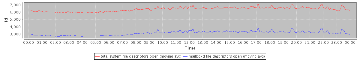 avg(total system file descriptors open) = 6418.70 avg(mailboxd file descriptors open) = 3121.26
