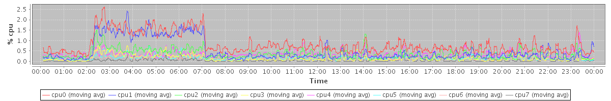 avg(cpu0) = 0.14 avg(cpu1) = 0.07 avg(cpu2) = 0.04 avg(cpu3) = 0.00 avg(cpu4) = 0.03 avg(cpu5) = 0.00 avg(cpu6) = 0.00 avg(cpu7) = 0.00