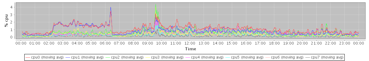 avg(cpu0) = 0.25 avg(cpu1) = 0.12 avg(cpu2) = 0.07 avg(cpu3) = 0.03 avg(cpu4) = 0.09 avg(cpu5) = 0.02 avg(cpu6) = 0.02 avg(cpu7) = 0.01