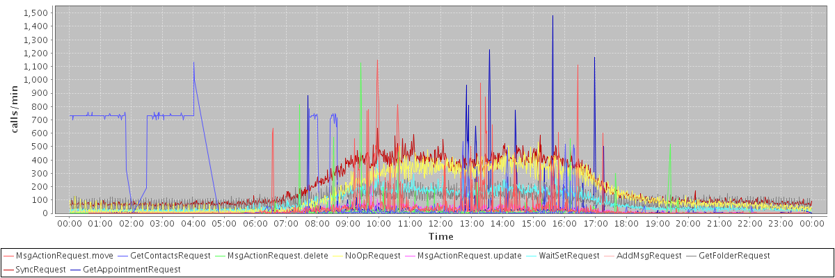 max(MsgActionRequest.move) = 1148.00 max(GetContactsRequest) = 1134.00 max(MsgActionRequest.delete) = 1128.00 max(NoOpRequest) = 536.00 max(MsgActionRequest.update) = 207.00 max(WaitSetRequest) = 400.00 max(AddMsgRequest) = 434.00 max(GetFolderRequest) = 287.00 max(SyncRequest) = 638.00 max(GetAppointmentRequest) = 1482.00