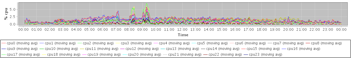 avg(cpu0) = 0.28 avg(cpu1) = 0.29 avg(cpu2) = 0.14 avg(cpu3) = 0.14 avg(cpu4) = 0.08 avg(cpu5) = 0.13 avg(cpu6) = 0.06 avg(cpu7) = 0.05 avg(cpu8) = 0.04 avg(cpu9) = 0.09 avg(cpu10) = 0.02 avg(cpu11) = 0.17 avg(cpu12) = 0.12 avg(cpu13) = 0.04 avg(cpu14) = 0.10 avg(cpu15) = 0.01 avg(cpu16) = 0.19 avg(cpu17) = 0.01 avg(cpu18) = 0.01 avg(cpu19) = 0.07 avg(cpu20) = 0.01 avg(cpu21) = 0.01 avg(cpu22) = 0.00 avg(cpu23) = 0.02