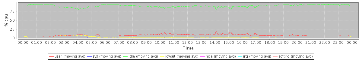 avg(user) = 7.96 avg(sys) = 0.36 avg(idle) = 89.96 avg(iowait) = 1.67 avg(nice) = 0.00 avg(irq) = 0.00 avg(softirq) = 0.04