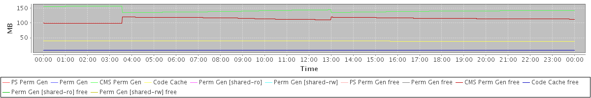 avg(PS Perm Gen) = 0.00 avg(Perm Gen) = 0.00 avg(CMS Perm Gen) = 142.37 avg(Code Cache) = 38.71 avg(Perm Gen [shared-ro]) = 0.00 avg(Perm Gen [shared-rw]) = 0.00 avg(PS Perm Gen free) = 0.00 avg(Perm Gen free) = 0.00 avg(CMS Perm Gen free) = 113.63 avg(Code Cache free) = 7.97 avg(Perm Gen [shared-ro] free) = 0.00 avg(Perm Gen [shared-rw] free) = 0.00
