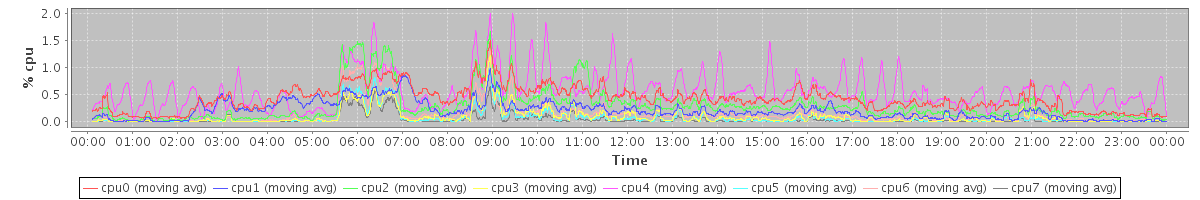 avg(cpu0) = 1.85 avg(cpu1) = 1.14 avg(cpu2) = 1.35 avg(cpu3) = 0.66 avg(cpu4) = 1.42 avg(cpu5) = 0.49 avg(cpu6) = 0.76 avg(cpu7) = 0.30