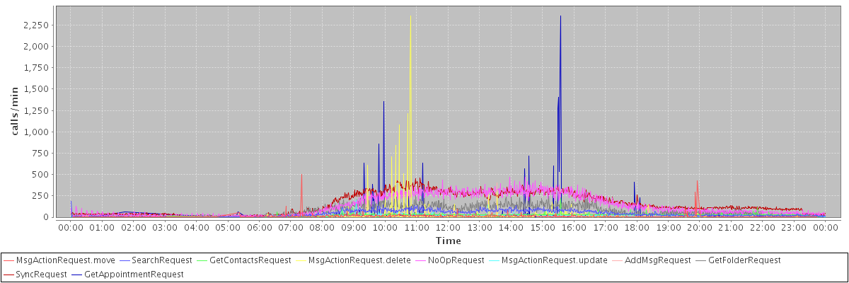 max(MsgActionRequest.move) = 499.00 max(SearchRequest) = 184.00 max(GetContactsRequest) = 230.00 max(MsgActionRequest.delete) = 2359.00 max(NoOpRequest) = 471.00 max(MsgActionRequest.update) = 207.00 max(AddMsgRequest) = 400.00 max(GetFolderRequest) = 291.00 max(SyncRequest) = 456.00 max(GetAppointmentRequest) = 2353.00