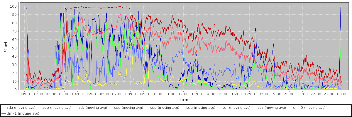 avg(sda) = 43.13 avg(sdb) = 22.31 avg(sdc) = 21.90 avg(sdd) = 7.34 avg(sdp) = 43.14 avg(sdq) = 22.32 avg(sdr) = 21.87 avg(sds) = 7.42 avg(dm-0) = 58.61 avg(dm-1) = 28.72