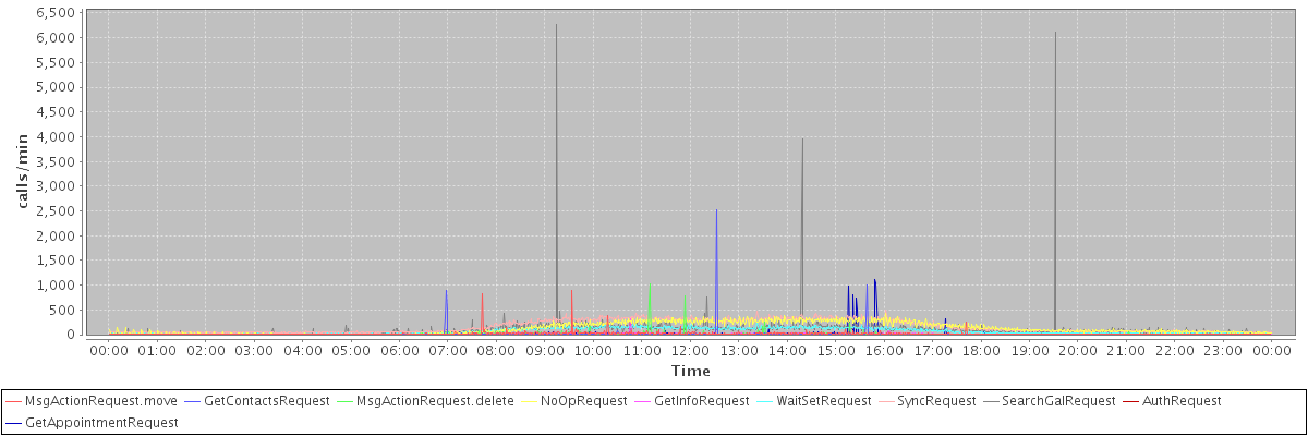max(MsgActionRequest.move) = 884.00 max(GetContactsRequest) = 2530.00 max(MsgActionRequest.delete) = 1035.00 max(NoOpRequest) = 423.00 max(GetInfoRequest) = 323.00 max(WaitSetRequest) = 250.00 max(SyncRequest) = 489.00 max(SearchGalRequest) = 6274.00 max(AuthRequest) = 317.00 max(GetAppointmentRequest) = 1110.00
