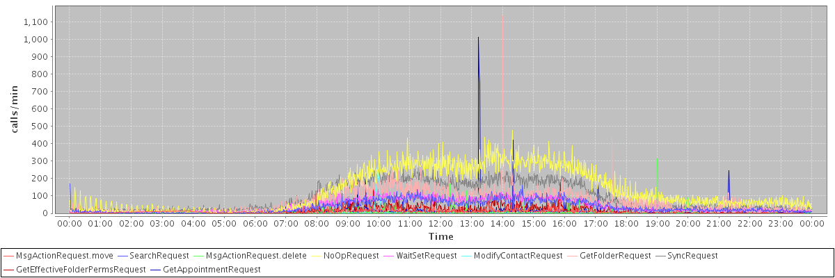 max(MsgActionRequest.move) = 130.00 max(SearchRequest) = 168.00 max(MsgActionRequest.delete) = 315.00 max(NoOpRequest) = 475.00 max(WaitSetRequest) = 136.00 max(ModifyContactRequest) = 274.00 max(GetFolderRequest) = 1136.00 max(SyncRequest) = 266.00 max(GetEffectiveFolderPermsRequest) = 176.00 max(GetAppointmentRequest) = 1013.00