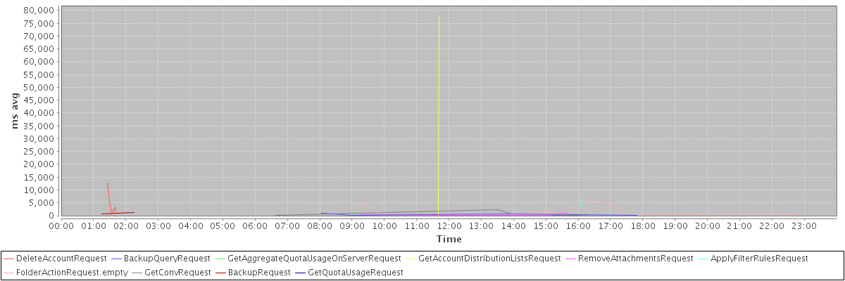avg(DeleteAccountRequest) = 5069.80 avg(BackupQueryRequest) = 439.20 avg(GetAggregateQuotaUsageOnServerRequest) = 1011.00 avg(GetAccountDistributionListsRequest) = 39002.50 avg(RemoveAttachmentsRequest) = 496.00 avg(ApplyFilterRulesRequest) = 5218.00 avg(FolderActionRequest.empty) = 1469.73 avg(GetConvRequest) = 486.67 avg(BackupRequest) = 841.00 avg(GetQuotaUsageRequest) = 1096.00