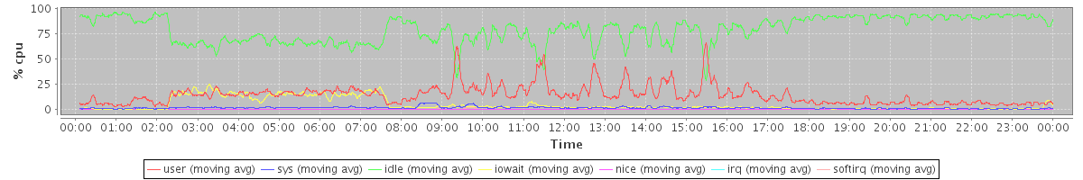 avg(user) = 14.12 avg(sys) = 1.55 avg(idle) = 79.41 avg(iowait) = 4.74 avg(nice) = 0.00 avg(irq) = 0.00 avg(softirq) = 0.18