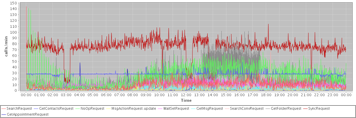 max(SearchRequest) = 144.00 max(GetContactsRequest) = 49.00 max(NoOpRequest) = 141.00 max(MsgActionRequest.update) = 40.00 max(WaitSetRequest) = 40.00 max(GetMsgRequest) = 33.00 max(SearchConvRequest) = 67.00 max(GetFolderRequest) = 102.00 max(SyncRequest) = 114.00 max(GetAppointmentRequest) = 48.00